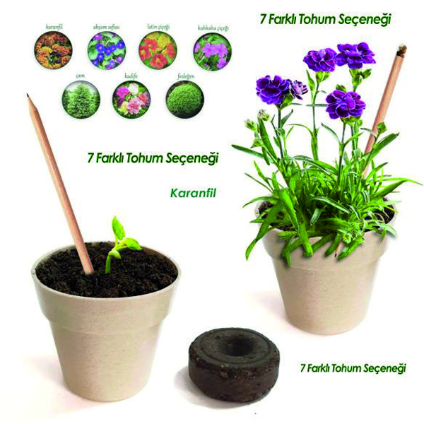 Kalemli Saksılı Çiçek Dikim Seti, ofisinizde, evinizde veya bahçenizde doğanın güzelliğini yaşamanıza olanak tanıyan eşsiz bir hediyelik eşyadır. Set içerisinde 6 cm * 6,5 cm ebatlarında bir saksı, sıkıştırılmış toprak ve tohumlu doğal kurşun kalem bulunur. Kalem, Karanfil, Fesleğen, Çam Ağacı, Akşam Sefası, Kahkaha Çiçeği, Latin Çiçeği veya Kadife Çiçeği gibi farklı tohum seçenekleri ile birlikte gelir.