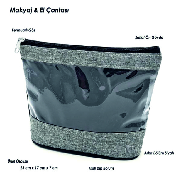 Toptan satışa sunulan bu şık makyaj çantası, keten desenli imperteks kumaştan üretilmiştir. 23x17x7 cm boyutlarıyla makyaj malzemelerinizi düzenli bir şekilde taşımanıza olanak tanır.