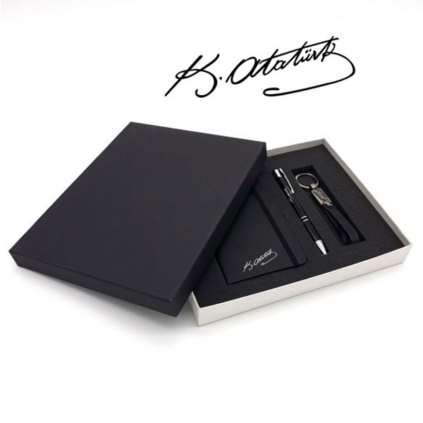 ATATÜRK İmzalı 3'lü Set, özel günleriniz veya şirket promosyonlarınız için ideal bir seçimdir. Termo deri defter, metal tükenmez kalem ve metal döküm termo deri anahtarlık, elegan ve şık tasarımlarıyla dikkat çeker. Setin içerisinde bulunan ATATÜRK imzası, hediyeyi daha da anlamlı kılar.