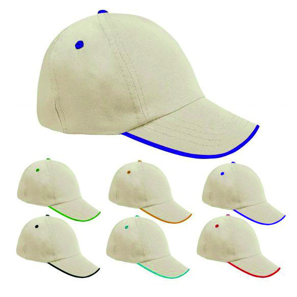 Bej renk gövde ve renkli biyeli promosyon şapka, yerli üretim ve polyester özel şapka kumaşından üretilmiştir. Şapkamız siperli, siper üstü kumaş kaplı, siper üzerinde 4 dikişli, 5 panel, 2 panelde kuş gözü ve arka bölümde ölçü ayarlama için cırt bantlıdır. Tek renk veya çok renk baskı imkanı sunan şapkamız, işletmeniz için mükemmel bir promosyon ürünüdür.