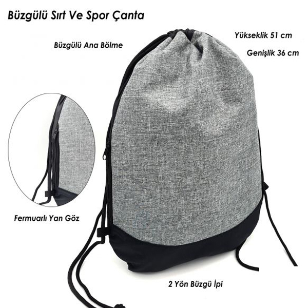 Çanta, 2 yönlü büzgü ve taşıma ipi ile rahat taşınabilir. Fermuarlı yan göz, küçük eşyaların güvenli bir şekilde saklanmasını sağlar. Ayrıca, serigrafi ve transfer baskı seçenekleri ile kişiselleştirilebilir.