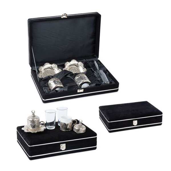 * Kadife kutu saten kaplama iç: Cezveli Türk Kahvesi Seti, şık ve zarif bir kadife kutuda sunulur. Kutu, saten kaplama iç ile süslenmiştir.