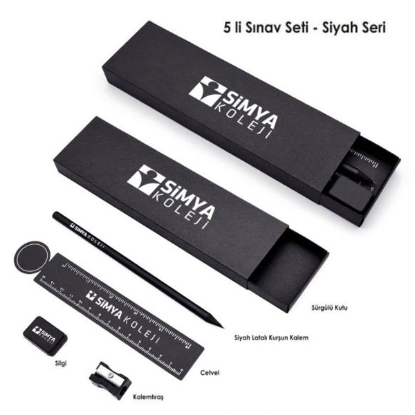 Bu ekonomik Siyah Sınav Seti, öğrenciler ve işletmeler için ideal bir promosyon ürünüdür. Set içerisinde 1 adet siyah sürgülü kraft kutu, 1 adet kitap ayraçlı cetvel, 1 adet siyah latalı kurşun kalem, 1 adet siyah silgi ve 1 adet siyah kalemtıraş bulunur.